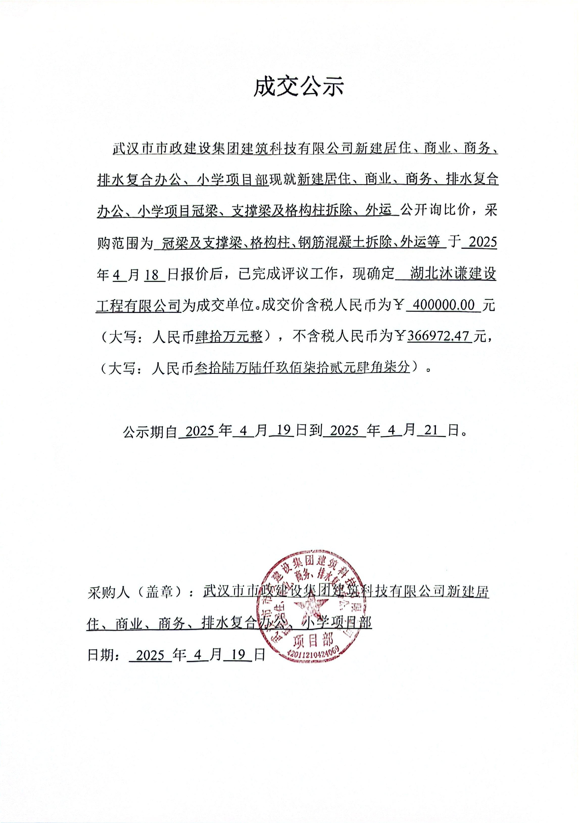 武漢市市政建設(shè)集團(tuán)建筑科技有限公司新建居住、商業(yè)、商務(wù)、排水復(fù)合辦公、小學(xué)項(xiàng)目冠梁、支撐梁及格構(gòu)柱拆除、外運(yùn)成交公示